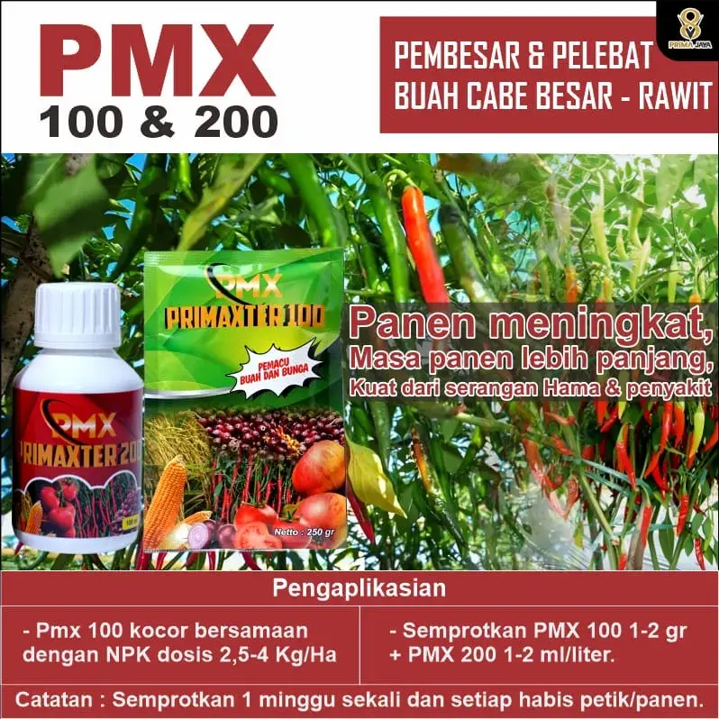 PMX PRIMAXTER 200 merupakan terobosan teknologi pupuk pemacu tumbuh dari PT Prima Jaya Semesta Internasional berbentuk cair dengan kandungan hormon lengkap dan nutrisi untuk semua jenis tanaman.